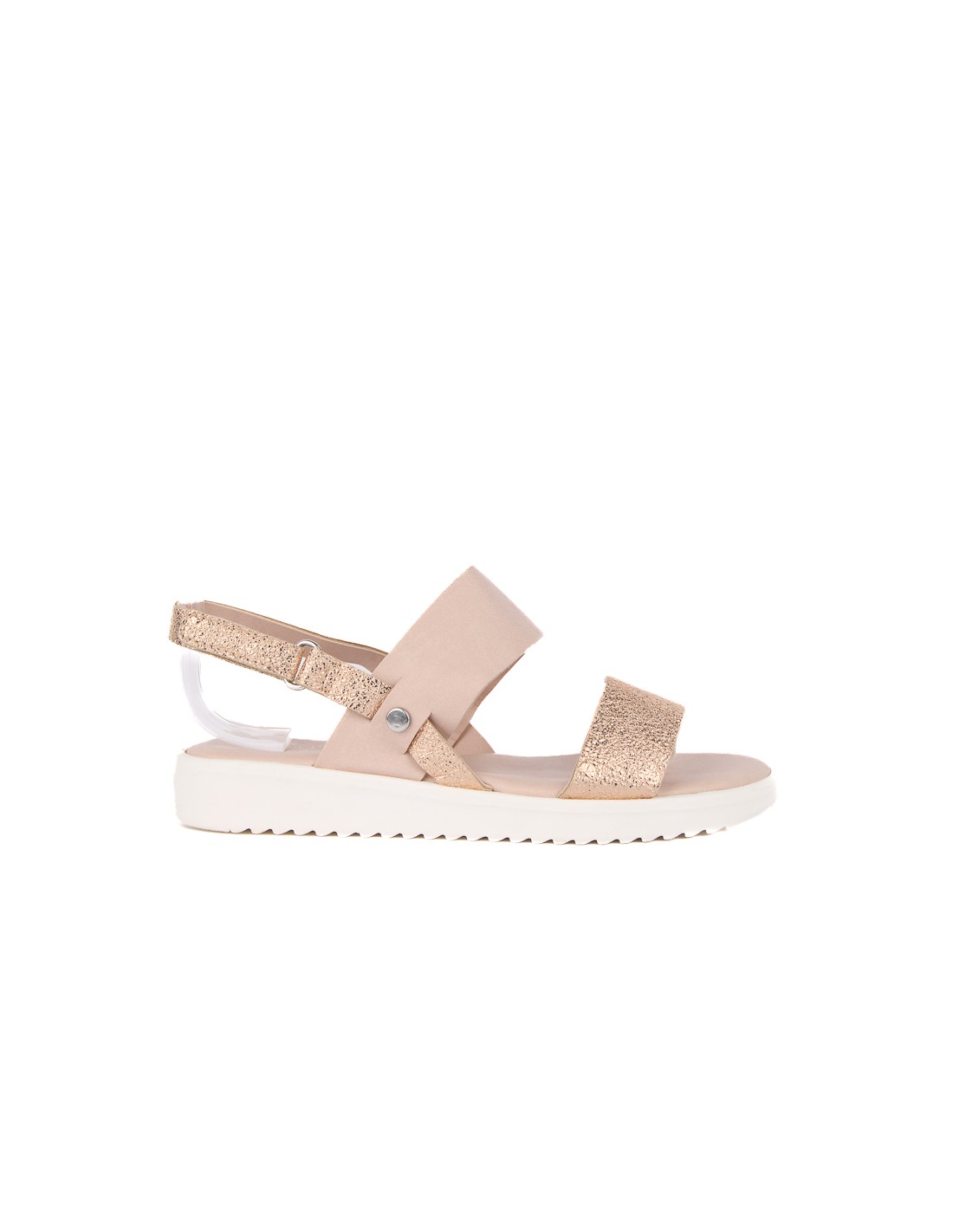Sandalia de nina color rosado de tira detalle de brillos material cuerina sujetador de velcro plantilla de goma con pequena plataforma de goma