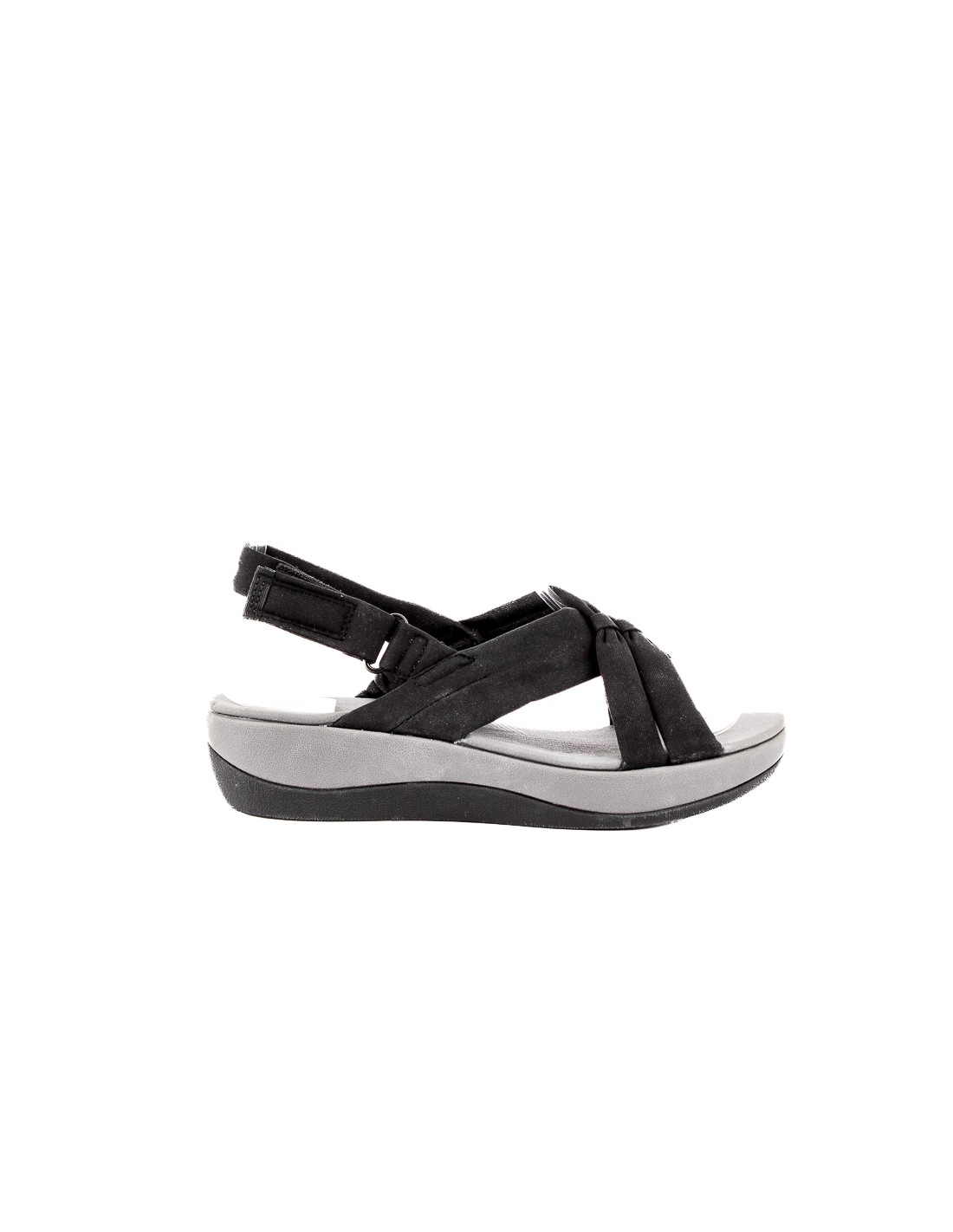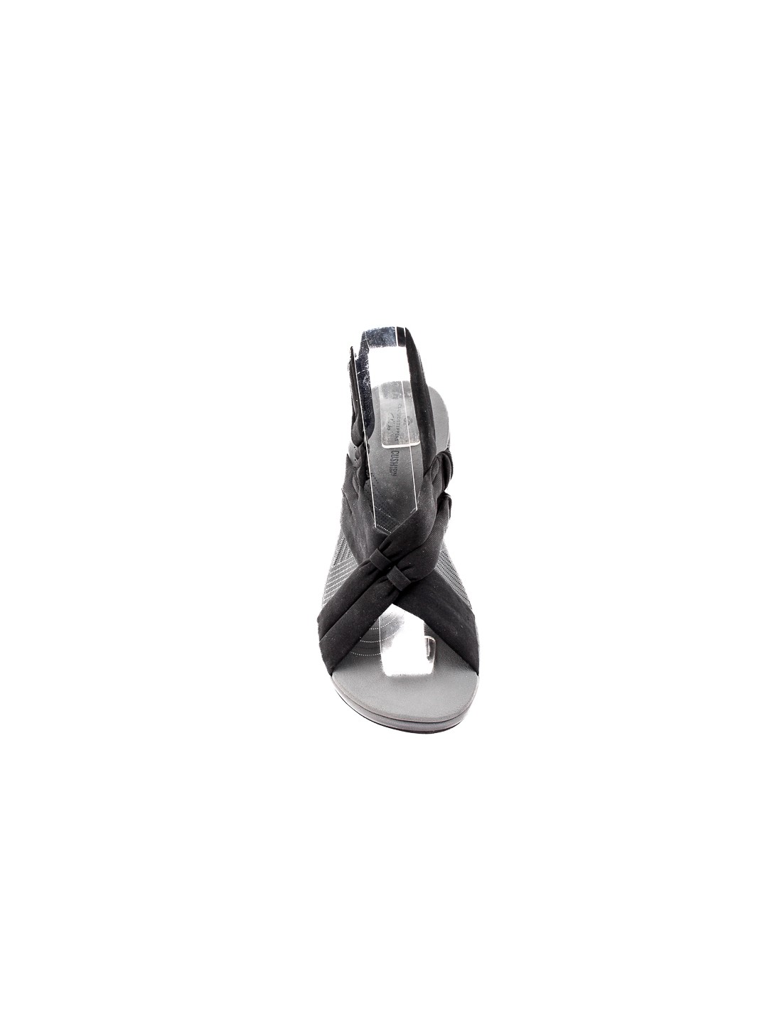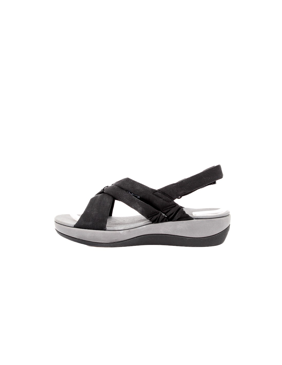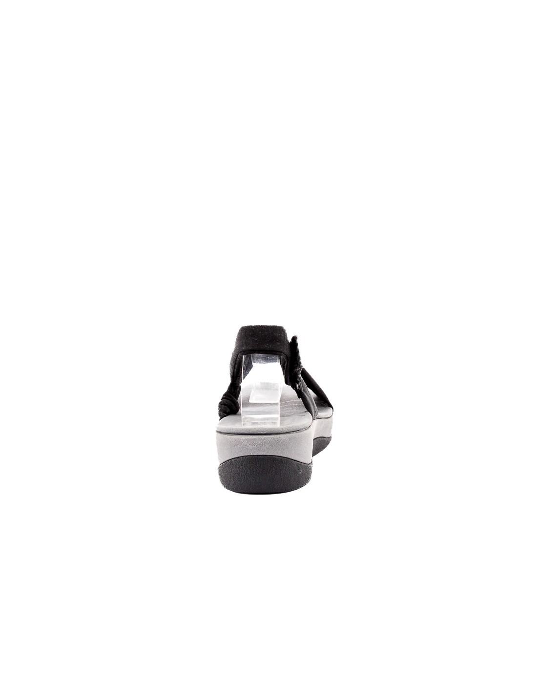 Sandalia de mujer color negro de tiras material elastico cruzadas y detalles de nudo sujetador de velcro posterior plantilla y entresuela de goma
