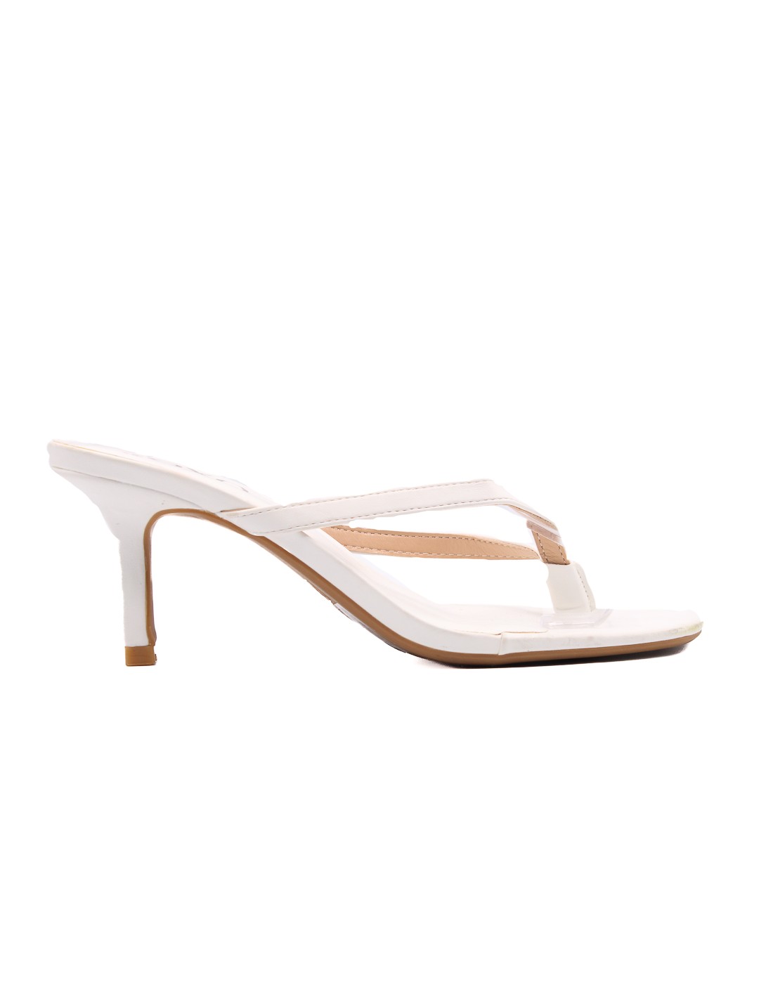 Sandalia de taco color blanco con tira en V taco medio fino material sintetico