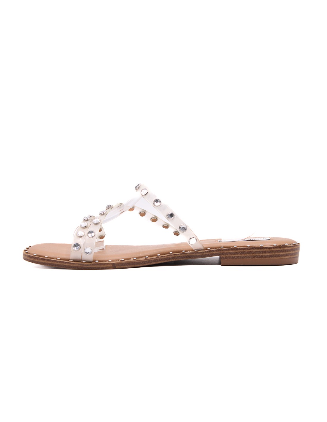 Sandalia de mujer de tiras transparentes con brillos circulares plantilla cafe sintetico con detalles y suela sintetica