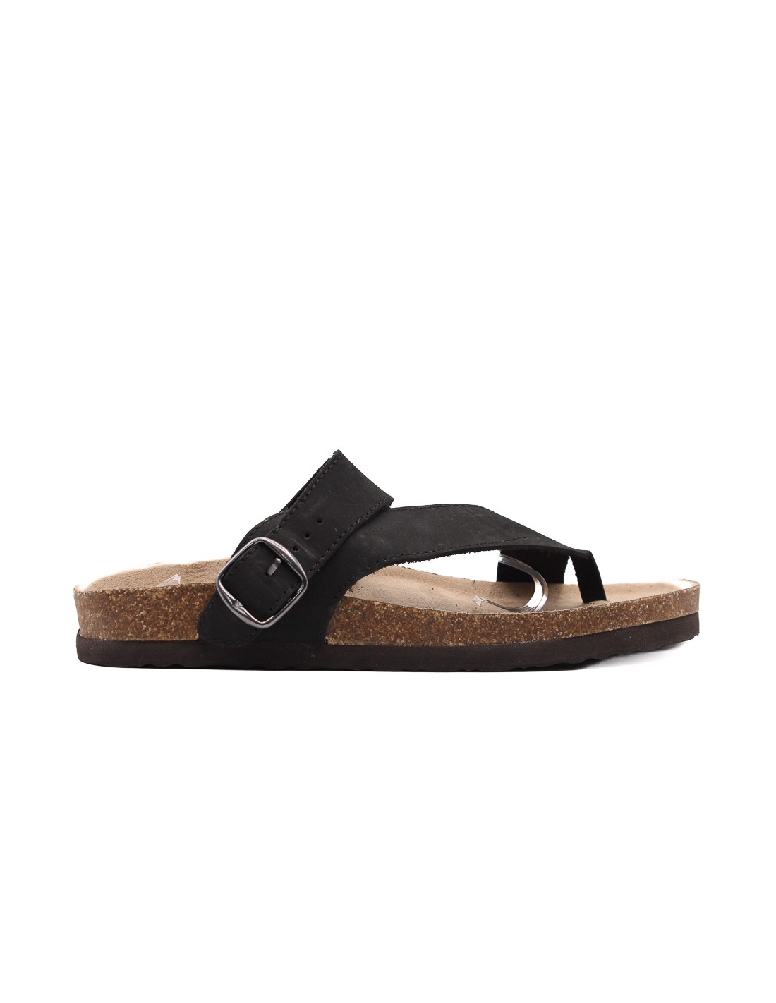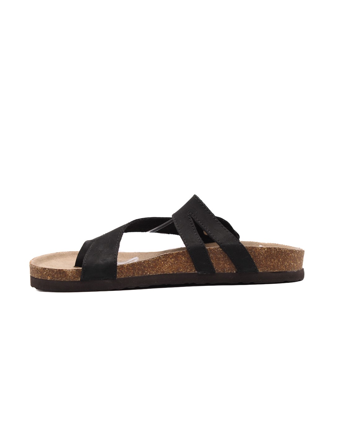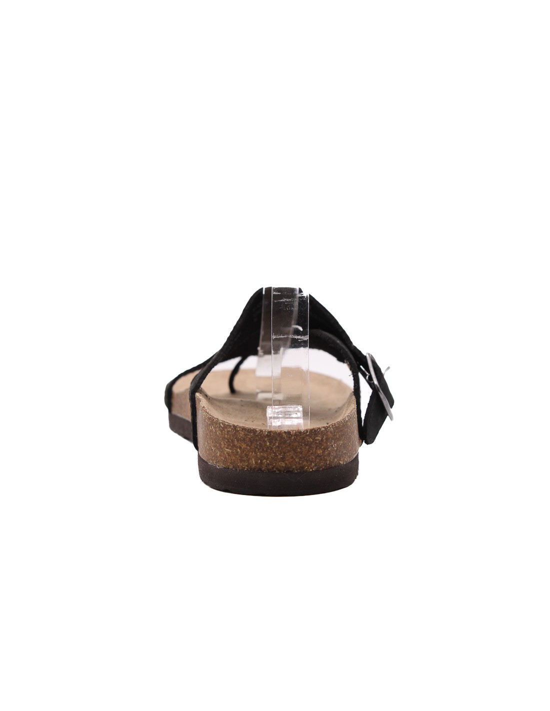 Sandalia de mujer de tiras color negro con detalle de hebilla material de cuerina plantilla suave de gamusa entresuela de corcho y suela material de espuma