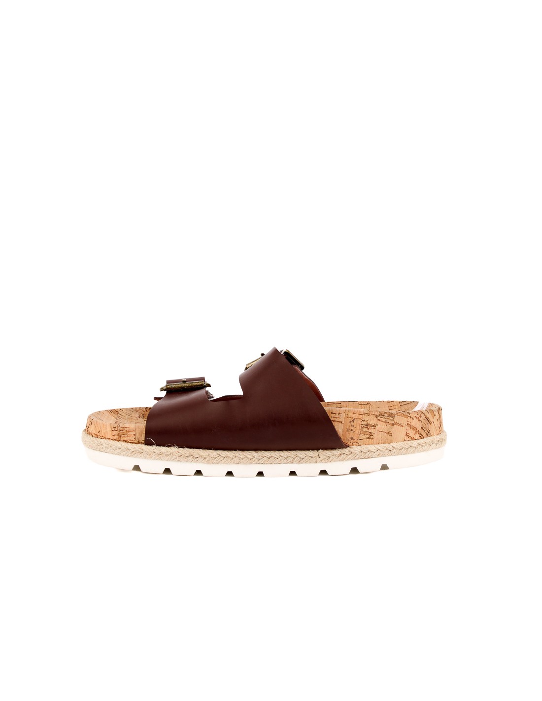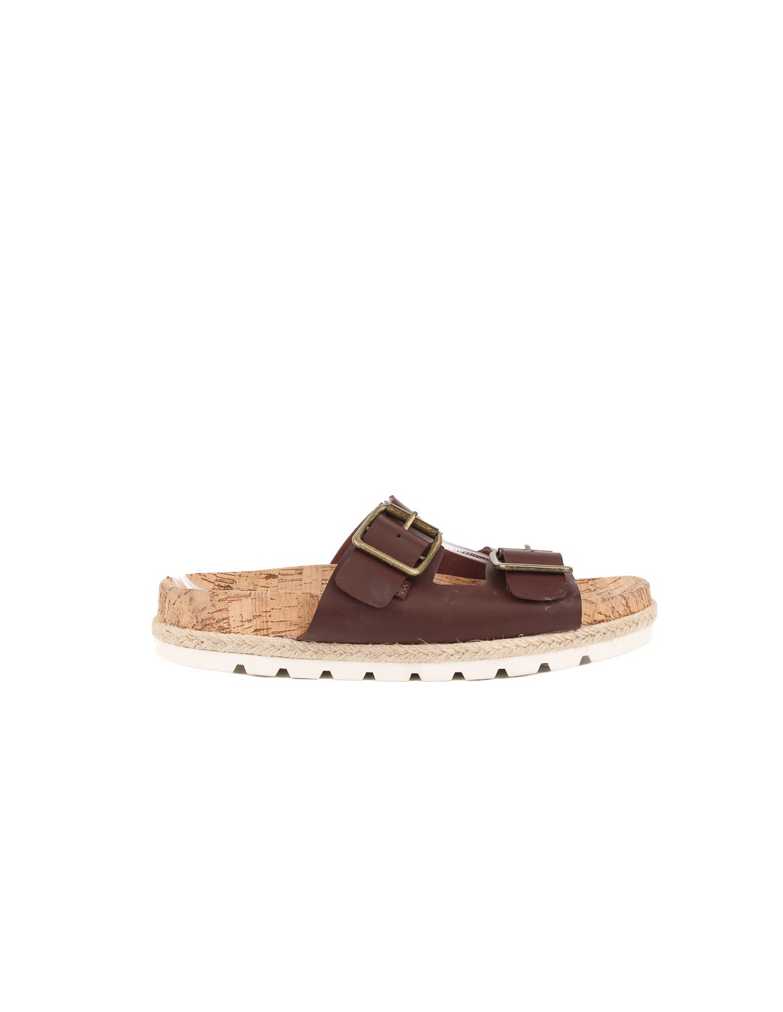 Sandalias de mujer tiras color cafe con hebilla de cobre suela de corcho, cabuya y goma