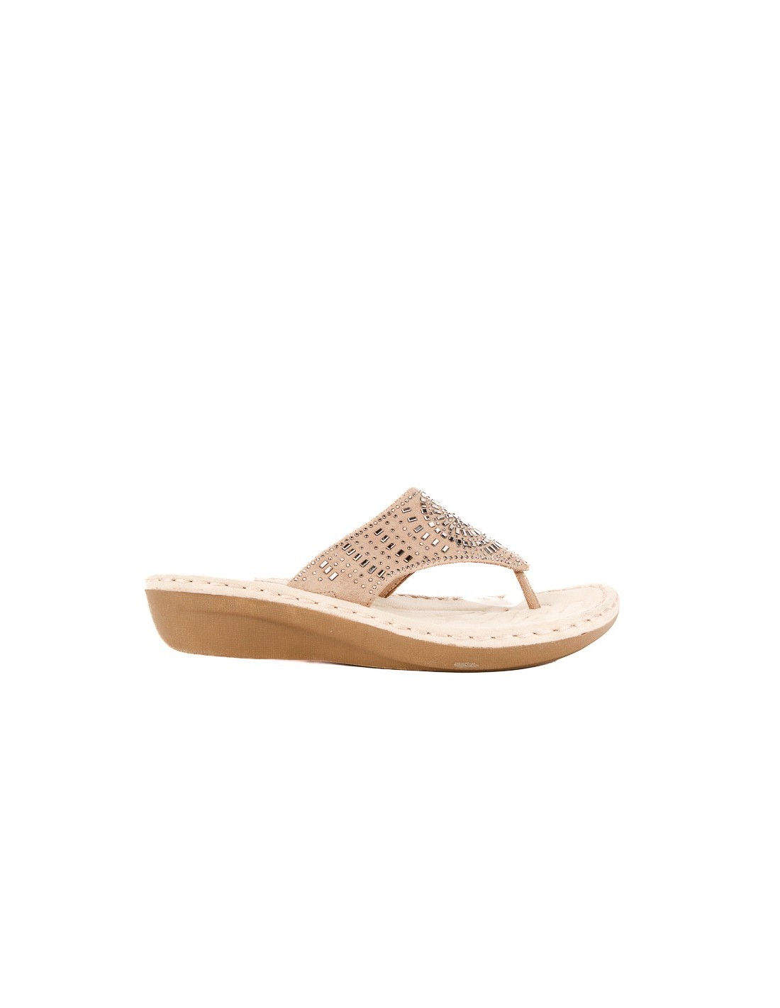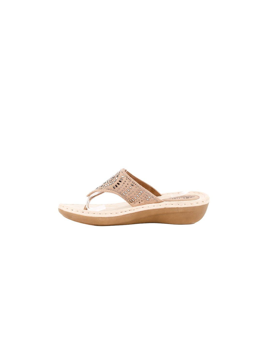Sandalias de mujer de tira crema con brillos entresuela de color cafe claro material de goma plantilla de gamusa